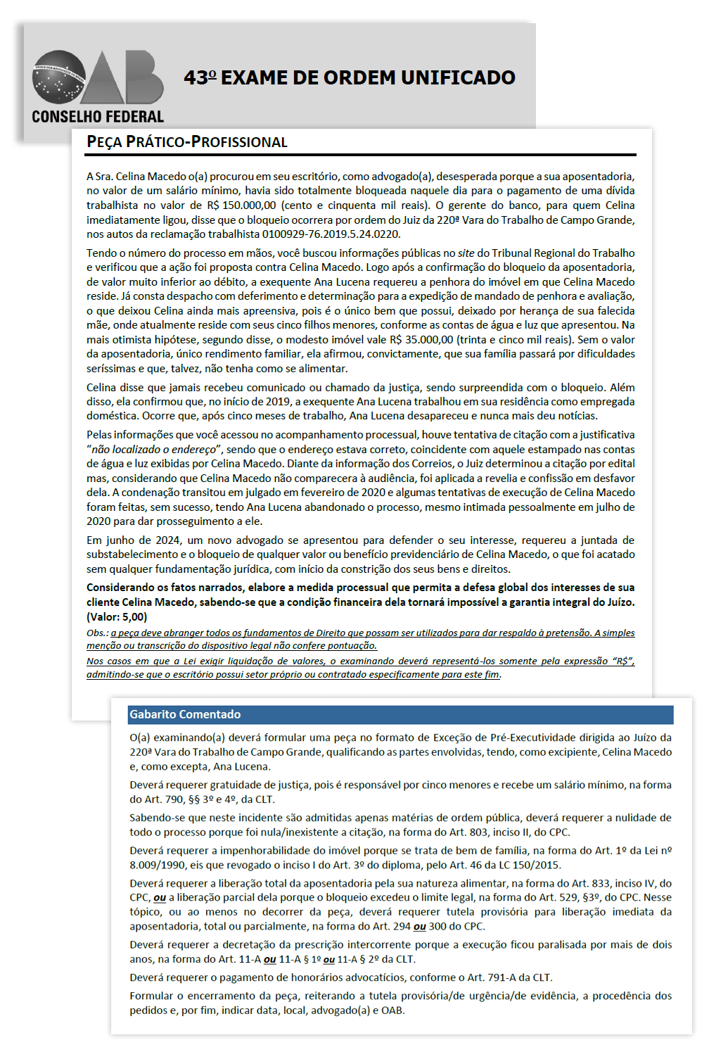Na prova prático-profissional de Direito do Trabalho, a Fundação Getulio Vargas (FGV), banca organizadora do Exame de Ordem, cobrou dos candidatos a elaboração de uma “exceção de pré-executividade”. A peça, embora amplamente conhecida no meio jurídico, não possui previsão expressa na Consolidação das Leis do Trabalho (CLT) ou no Código de Processo Civil (CPC), e sua admissibilidade no processo do trabalho decorre de construção jurisprudencial.